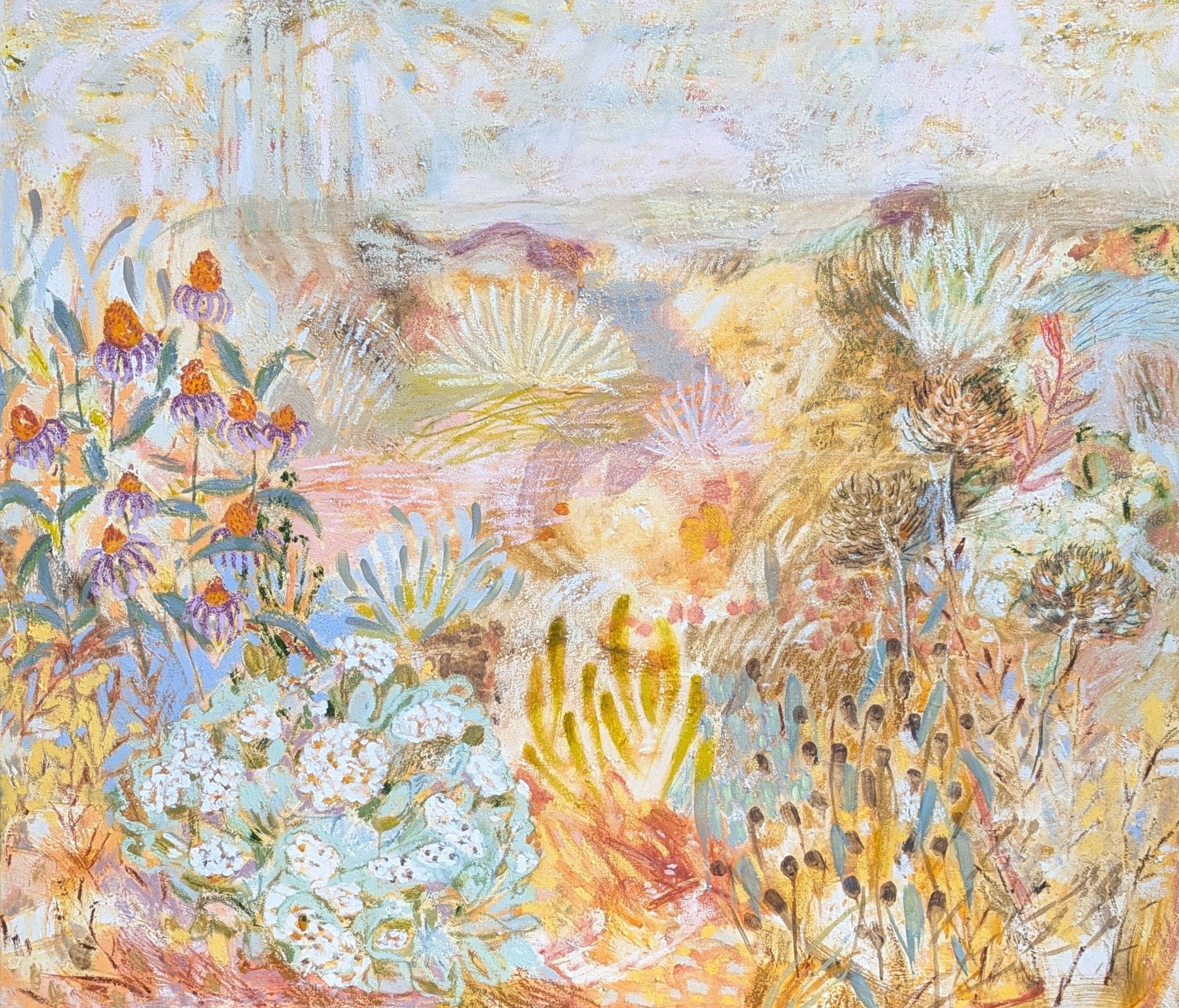 Her practice is grounded in the Australian bushland, where intuitive mark-making and layered surfaces create contemplative spaces that invite viewers into a sensory dialogue with nature.